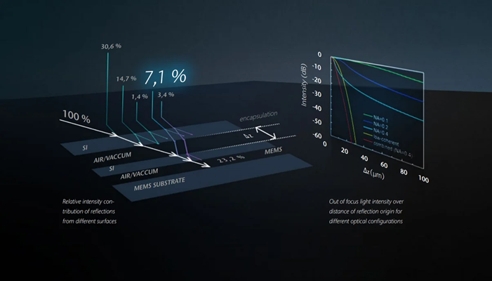 Poyltec采用低相干光来提高精度,与激光相反,超辐射二极管发出的低相干光只有在干涉仪中的光路与光源的相干长度相等时才会产生干涉,从而将焦点处以外的光排除在外。这一原理被用于白光干涉仪或光学相干层析术,现在首次用于激光多普勒测振仪(LDV)。对MEMS器件进行扫描测试时,带宽高达25 MHz,振幅分辨率达100 fm/ Hz。