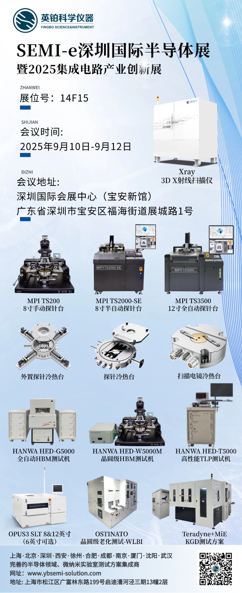 我们此次将会带来多种半导体产品和专业测试方案,SiC/GaN/Si功率器件测试方案(CP/KGD/WLBI设备)、X射线分析方案(3D X射线扫描仪-Xray等)、ESD/TLP测试仪、手动/半自动/全自动/低温探针台,英铂冷热台系列等,英铂敬候您的光临!