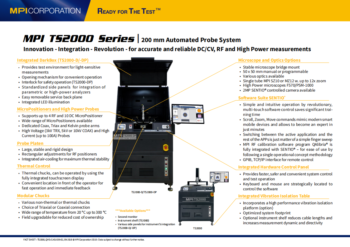 TS2000-DP是MPI提供一套多功能且经济高效的8寸半自动高功率测试探针台,可在20°C至300°C的温度范围内进行晶圆载片上高功率应用的测量,且测量能力高达3kV(三轴)/10kV(同轴)和600A(脉冲)。