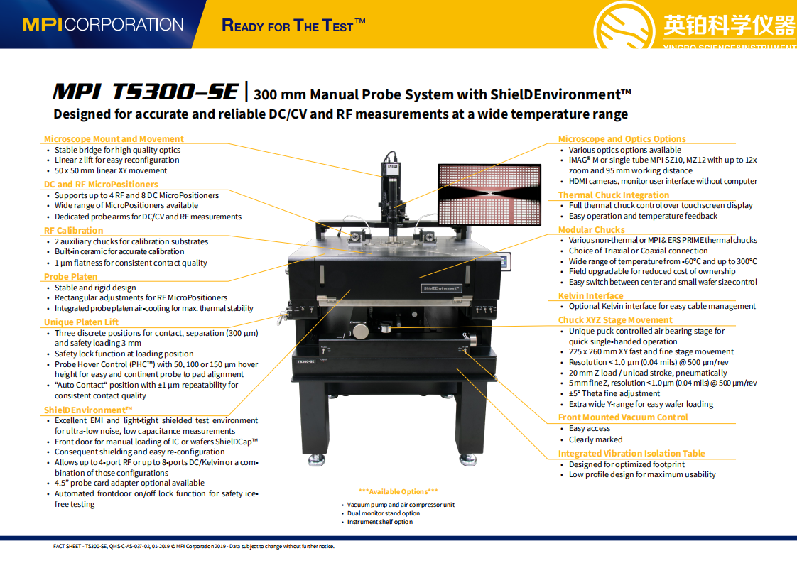 MPI旗下全套探针台测试系统均具备模块化设计创造了独特的升级途径。所有TS300-SE探测附件,例如热卡盘,显微镜和定位器,都可以升级或重新配置,以适应涵盖工具寿命的各种应用需求,从而使拥有成本降低。具有ShielDEnvironment™的MPI TS300-SE探针系统可提供EMI屏蔽,并允许进行低噪声的器件在片测量,从而可广泛用于各种应用,例如器件表征和建模,RF /微波,晶片级可靠性,失效分析, 设计验证和大功率等。