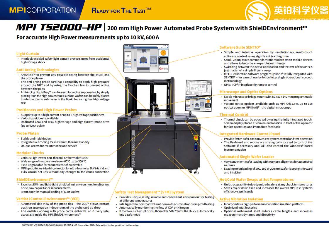 MPI的TS2000-HP半自动化探针台测试系统可提供8英寸及以下晶圆器件的高功率测量,先进的ShielDEnvironment™可提供低噪声和屏蔽的测试环境。