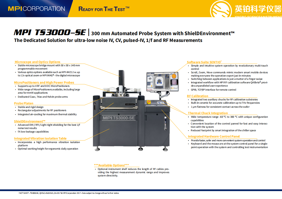 TS3000-SE是TS3000探针台系统的升级开发,该系统配备了MPI ShielDEnvironment™,可实现超低噪声,满足设备的需求表征,晶圆级可靠性以及RF和mmW等多种应用。