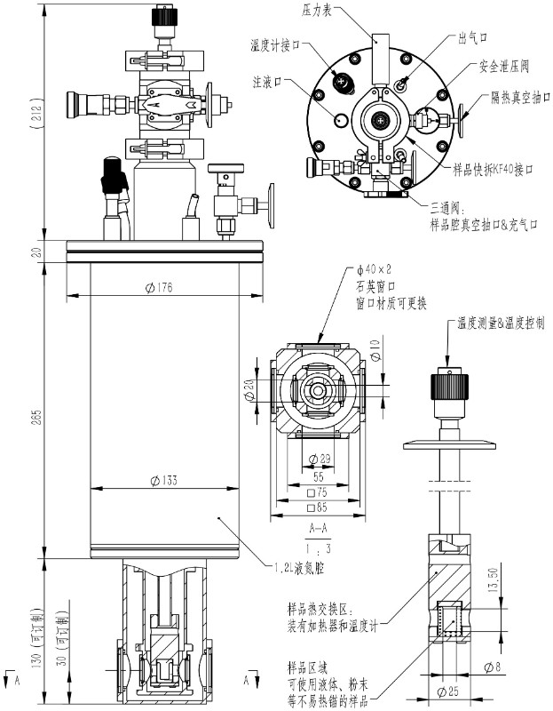该类型恒温器主要测试样品为液体、粉末、热导率差的样品以及不规则样品,采用液氮制冷,样品整体处于气氛中;工作温度在78K-500K,通过减压技术温度可低至65K,同时高温版的恒温器温度可高至700K。